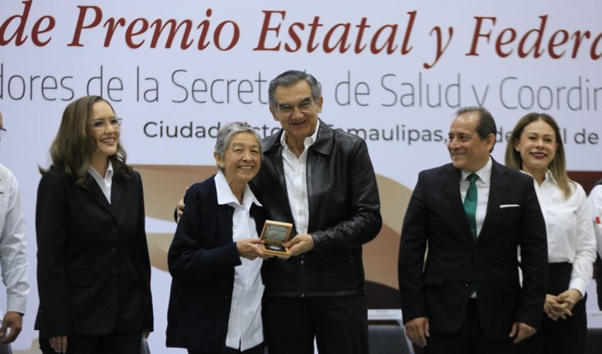 Acompañado por Marggid Rodríguez Avendaño, coordinador de IMSS-Bienestar en Tamaulipas y dirigentes sindicales, el jefe del Ejecutivo entregó 37 premios de antigüedad, de un total de 1,400 a personal de salud, destacando por 60 años de servicio, Almarcelia Cárdenas Guardado, enfermera general titulada «B», del Distrito de Salud para el Bienestar I, en Ciudad Victoria.